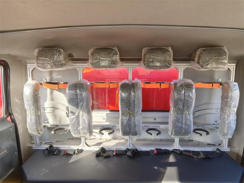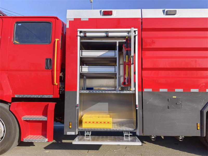 • Жабдық бөлмесі: Көлік құралының қондырмасының алдыңғы жағында орналасқан бұл бөлме жабдық сөрелерімен және тартылатын аспа сөрелерімен жабдықталған. Стеллаждар әртүрлі өрт сөндіру құралдарын (өртке қарсы костюмдер, өрт көрпелері, шлангтардың қақпақтары, өрт көпірлері, өрт сөндіргіштер және т.б.) ұқыпты сақтауға арналған логикалық түрде жасалған; тартылатын ілулі сөрелер құтқару тиімділігін арттыра отырып, өрт сөндіру балталары, қалақшалар, күректер, кілттер, балғалар және ломдар сияқты жиі қолданылатын жабдыққа оңай және жылдам қол жеткізуді қамтамасыз етеді.